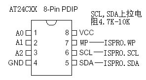 4、由于AT24CXX不支持ISP,我们只是利用一般的逻辑知识来实现在线编程的。建议设计单片机程序为:空闲时间单片机对WP,SCL,SDA的操作均为高电平或高阻状态,如果不能实现,请参考下一条建议。只有确保该条件,利用线与的方法来实现在线编程。
