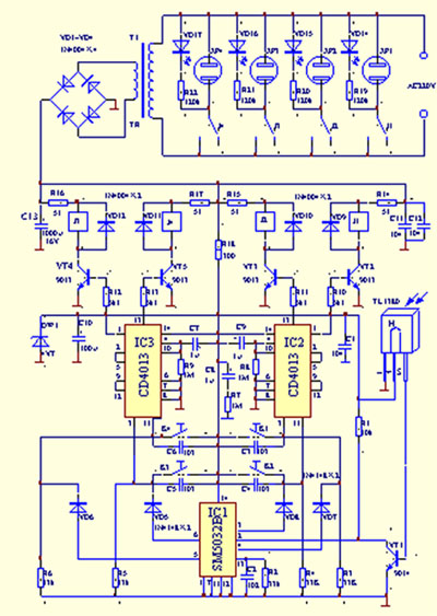 由于红外发光二极管的发射功率一般都较小(100毫瓦),所以红外接收头H接收到的信号比较微弱,红外接收头H将接收到的红外信号转换成电信号,经内部放大、解调、输出相应的码信号。再经VT1的放大、倒相后送至解码集成块IC1SM5032B2脚,这时SM5032B相应的非锁存输出端输出高电平,本接收电路中用到2CD4013(双D触发器),共4D触发器分别组成4个双稳态电路,SM5032B3456脚为4个非锁存输出端,VD5VD6VD7VD8为隔离二极管,IC2IC33脚和11脚为脉冲输入端,IC2IC31脚和13脚为双稳态电路的输出端,即分别控制继电器驱动控制电路的工作状态。